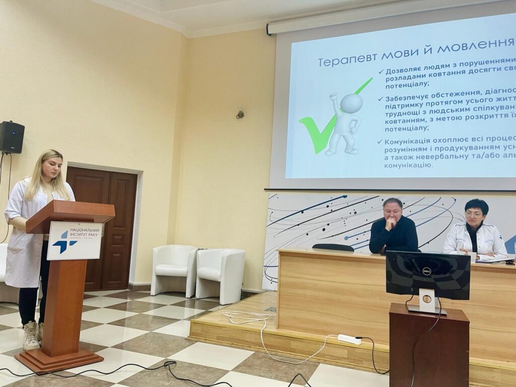 Про можливості співпраці лікарів структурних підрозділів з терапевтом мови та мовлення відділення фізичної та реабілітаційної медицини, та про роль терапевта мови та мовлення на етапі реабілітації розповіла терапевт мови та мовлення – Наталя Талімонова