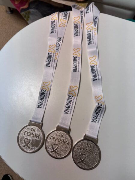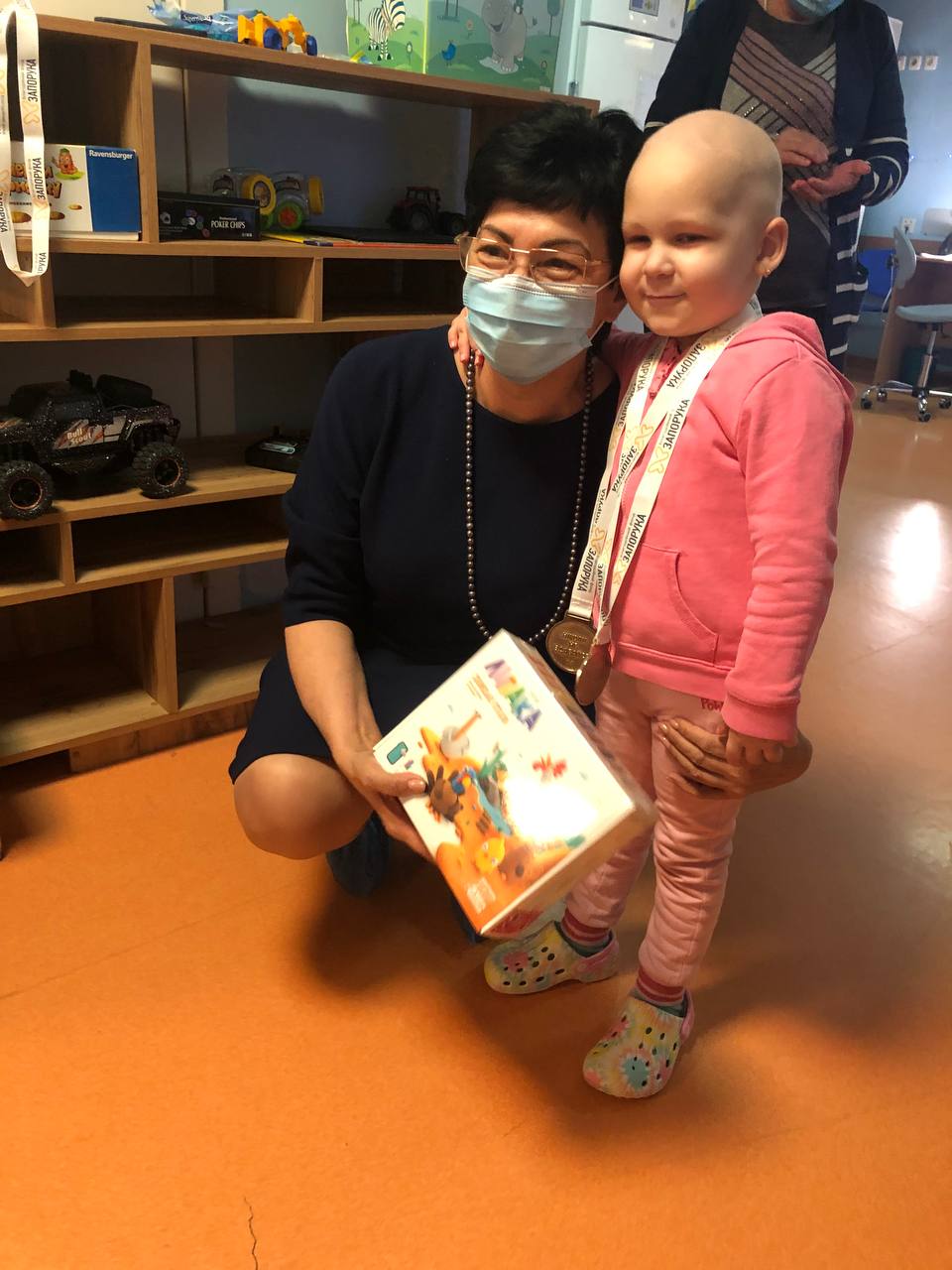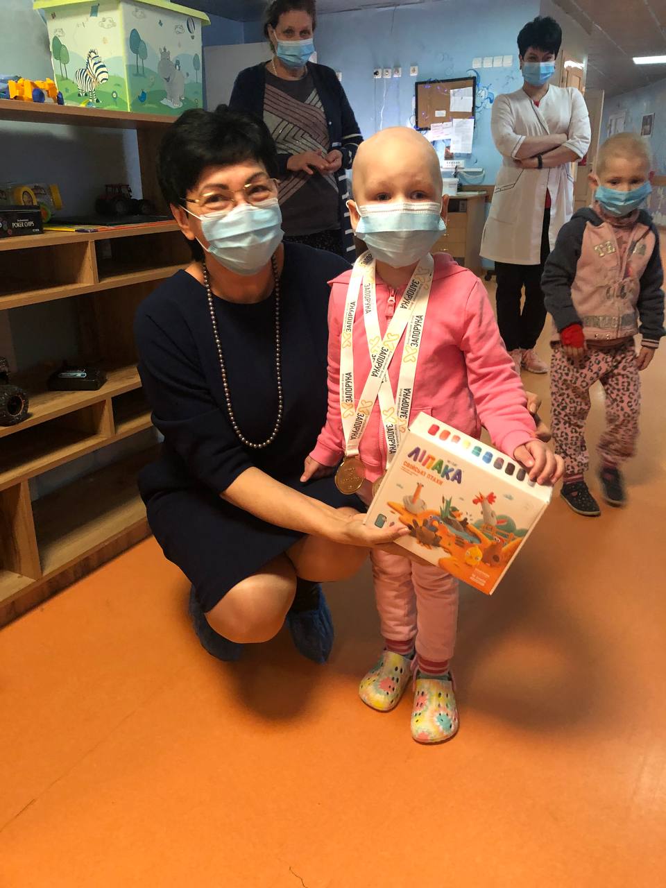 Трирічна Маргаритка отримала 2 медалі, адже за протоколом їй було проведено 2 елементи високодозної хіміотерапії з трансплантацією стовбурових клітин, які дівчинка пройшла дуже мужньо.