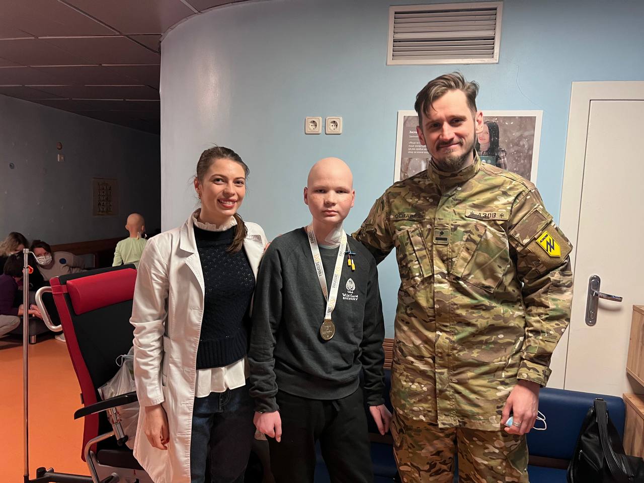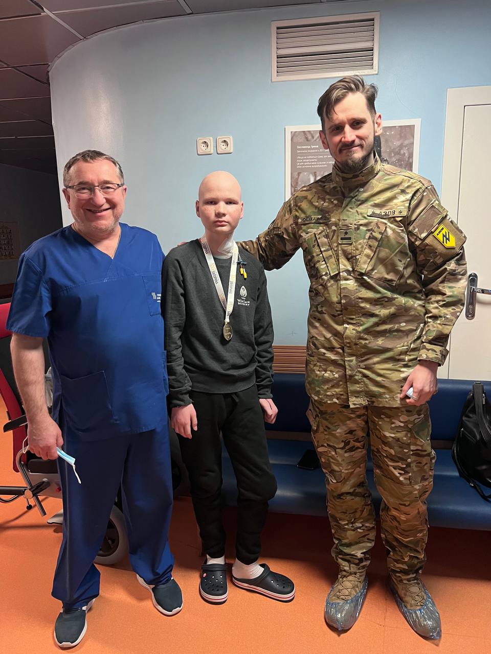 До відділу завітали Генеральна директорка ДНП «Національний інститут раку» Олена Єфіменко, її заступниця з організаційно-адміністративної роботи Олена Дерибон і боєць полку «Азов» на позивний «Oswald», аби привітати Маргаритку та Ігоря з успішно проведеною високодозною хіміотерапією та трансплантацією стовбурових клітин. З цієї нагоди Олена Єфіменко вручила медалі від БФ «Запорука».
