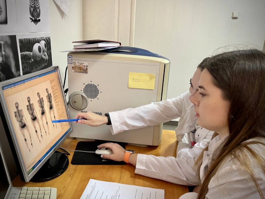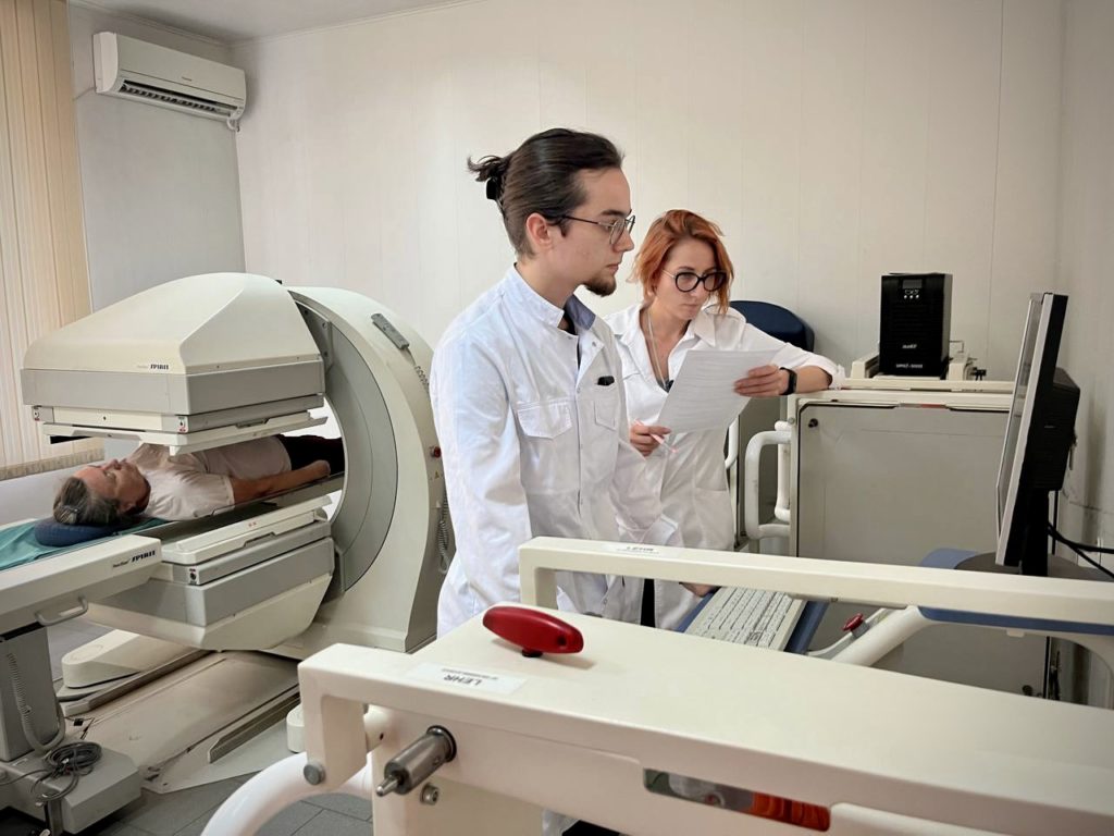 У серпні місяці інтерни-радіологи проходили навчання у науково-дослідному відділенні ядерної медицини з клінічним відділенням радіонуклідної діагностики і терапії під керівництвом д. мед. н. професора Солодяннікової Оксани Іванівни. Під керівництвом досвідченого куратора лікарі-інтерни пройшли ознайомлення з організацією радіологічної служби в Україні, нормативними документами, апаратурою та обладнанням для роботи у відділенні, детальний інструктаж щодо правил роботи з апаратурою, відкритими ізотопами, правил техніки безпеки хворого і персоналу, підбір необхідного технічного режиму опромінення.