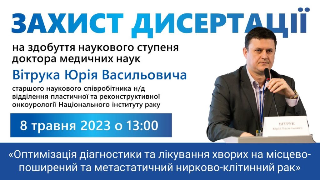 Захист дисертації на здобуття наукового ступеня доктора медичних наук старшого наукового співробітника н/д відділення пластичної та реконструктивної онкоурології Вітрука Юрія Васильовича відбудеться 8 травня 2023р. о 13:00 годині на засіданні спеціалізованої вченої ради Д 26.560.01 при ДНП «Національний інститут раку».