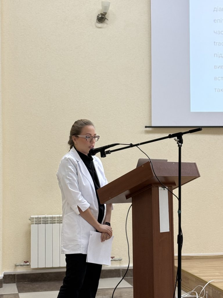 Аспірантка очної (денної) форми здобуття вищої освіти (спеціальність 222 «Медицина», спеціалізація «Онкологія») Анна Свінціцька презентувала тему дослідження, розповіла про його актуальність, мету, завдання, новизну, практичне значення, методи дослідження та відповіла на запитання членів Вченої ради.